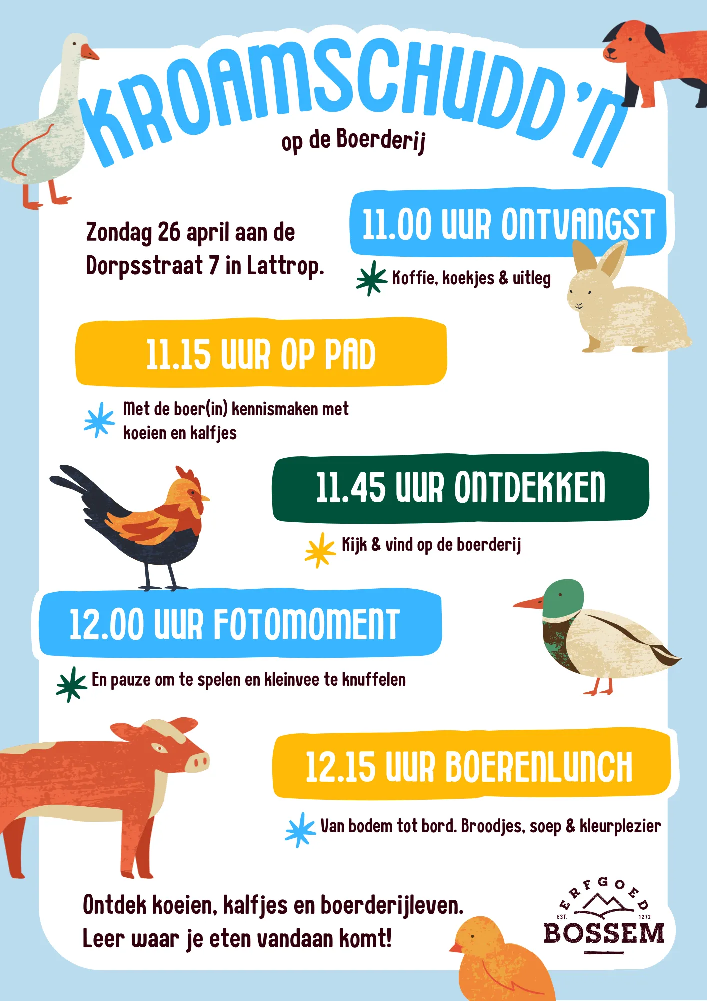 Op deze gezellige familiedag maak je kennis met de boerderij, ontmoet je de pasgeboren kalfjes en ontdek je hoe het dagelijkse eten van de boer tot op je bord komt. Kinderen kunnen kalfjes kijken, mee op ontdekkingstocht, kleuren en spelletjes doen én natuurlijk genieten van een (h)eerlijke boerenlunch.